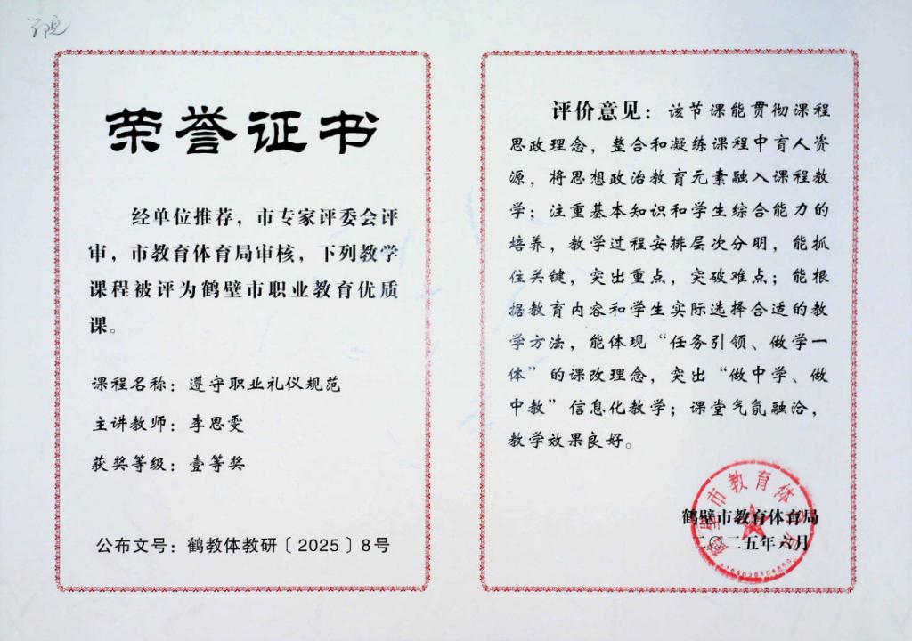 近日,公司304永利集团教师李思雯在2025年鹤壁市职业院校优质课教学评选活动中荣获一等奖。参赛教师紧扣职业教育培养目标,融入行业前沿案例,展现了公司优质课教学的丰硕成果。此次获奖不仅是对公司教师教学能力的肯定,更激励全院教师深耕教学一线,持续提升教学水平,为培养高素质技术技能人才奠定坚实基础。