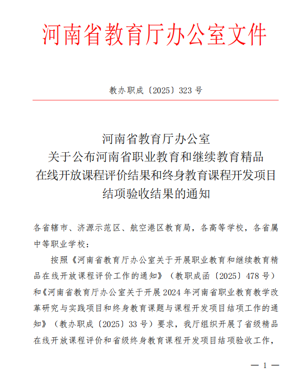 根据《河南省教育厅办公室关于开展职业教育和继续教育精品在线开放课程评价工作的通知》(教职成函〔2025〕478号)和《河南省教育厅办公室关于开展2024年河南省职业公司产品改革研究与实践项目和终身教育课题与课程开发项目结项工作的通知》(教办职成〔2025〕33号)要求,我厅组织开展了省级精品在线开放课程评价和省级终身教育课程开发项目结项验收工作,经公司自评、材料初审、专家会评、网上公示等环节,对各公司参评课程进行了全面评价,《形势与政策》1门课程通过河南省职业教育和继续教育精品在线开放课程评价。
